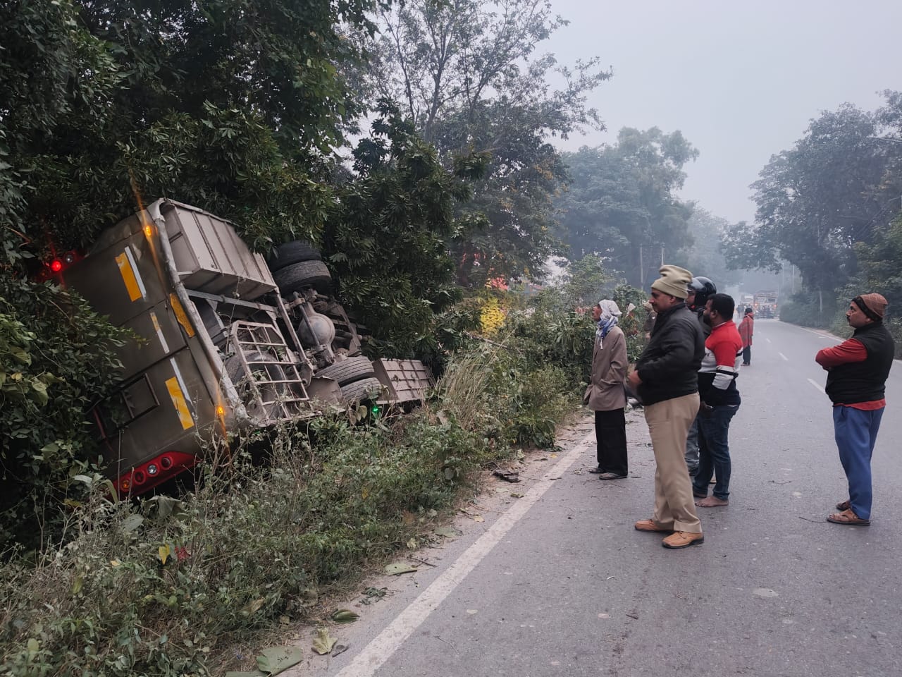 जिले के बलिया मोड़ ढाबा के पास पलट गई ।इस मे बस में लगभग 50 से 60 यात्री