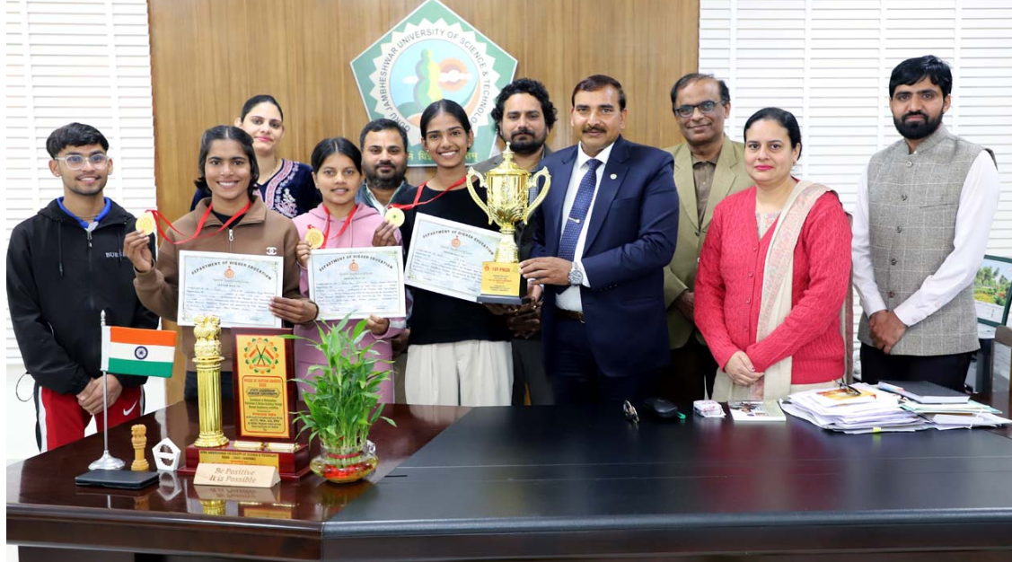 हिसार। गुरु जम्भेश्वर विज्ञान एवं प्रौद्योगिकी विश्वविद्यालय (जीजेयू), हिसार के योग विज्ञान विभाग के विद्यार्थियों ने राजकीय महाविद्यालय बरवाला (पंचकूला) में आयोजित राज्य स्तरीय इंटर कॉलेज योगासन चैंपियनशिप-2026 में उत्कृष्ट प्रदर्शन करते हुए स्वर्ण पदक हासिल किया। इस प्रतियोगिता का आयोजन हरियाणा के उच्चतर शिक्षा विभाग के तत्वावधान में किया गया था, जिसमें प्रदेश के विभिन्न महाविद्यालयों और विश्वविद्यालयों की टीमों ने भाग लिया। विश्वविद्यालय की महिला टीम ने प्रथम स्थान प्राप्त कर स्वर्ण पदक जीता। कुलपति प्रो. नरसी राम बिश्नोई ने विजेता विद्यार्थियों को बधाई देते हुए कहा कि योग के क्षेत्र में यह उपलब्धि विश्वविद्यालय के लिए गौरवपूर्ण है। उन्होंने उम्मीद जताई कि विद्यार्थी भविष्य में भी राष्ट्रीय और अंतरराष्ट्रीय स्तर पर उत्कृष्ट प्रदर्शन करेंगे। प्रतियोगिता में योग विभाग की छात्राएं रीटा, प्रीति और स्नेहलता, मनोविज्ञान विभाग की नैंसी तथा रसायन विज्ञान विभाग की मधु वर्मा ने भाग लेकर स्वर्ण पदक हासिल किया। योग विभाग की रीटा ने व्यक्तिगत स्पर्धा में भी स्वर्ण पदक जीता। साथ ही छात्र सुमित को भी सम्मानित किया गया, जिन्होंने राष्ट्रीय स्तर की विभिन्न योगासन प्रतियोगिताओं में गोल्ड मेडल हासिल कर विश्वविद्यालय की प्रतिष्ठा बढ़ाई है। इस अवसर पर योग विभाग के शिक्षकों ने भी विद्यार्थियों की उपलब्धि पर खुशी जताई और उनके उज्ज्वल भविष्य की कामना की।
