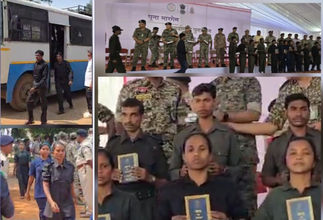 छत्तीसगढ़ के जगदलपुर में आत्मसमर्पण कार्यक्रम के मंच पर पंहुचे आत्मसमर्पित नक्सली, संविधान की प्रति दी गई