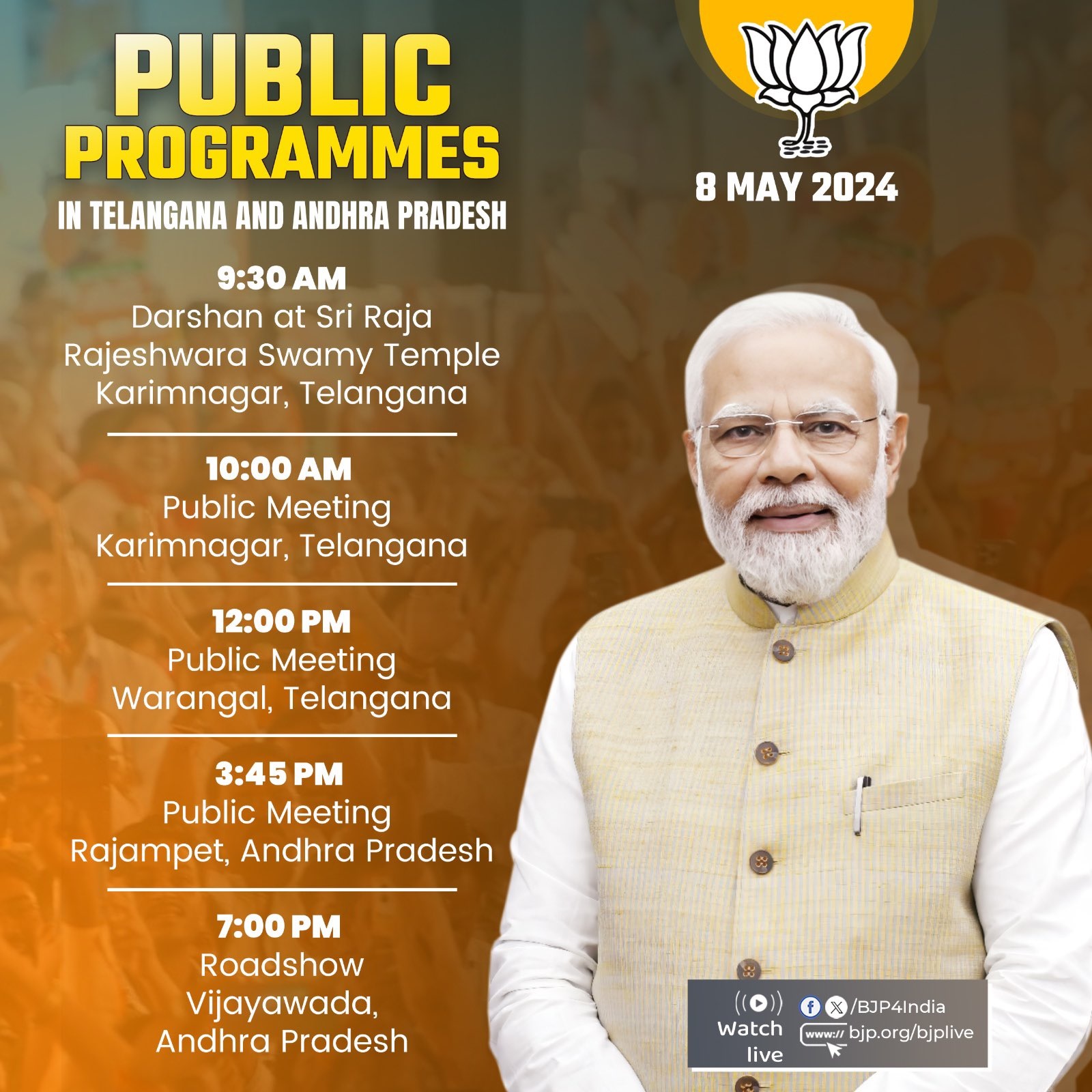 भाजपा के शीर्ष नेता एवं प्रधानमंत्री मोदी आज तेलंगाना और आंध्र प्रदेश में