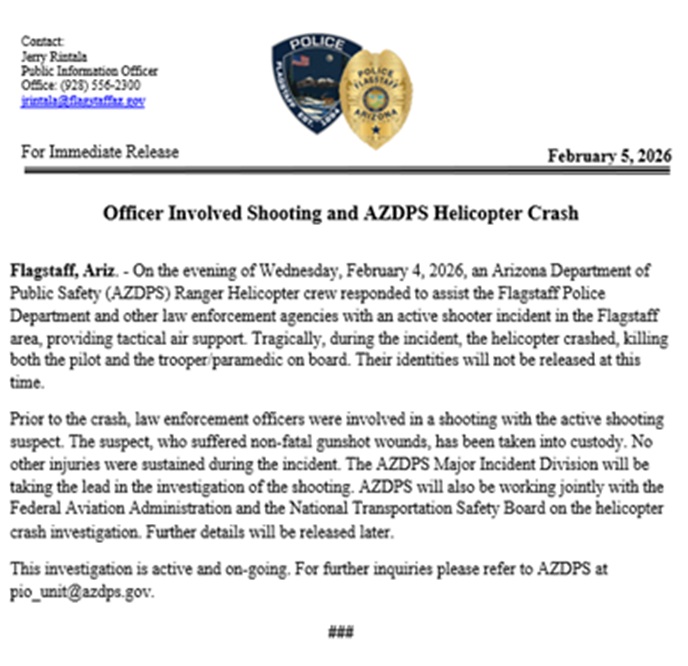 विज्ञप्ति में कहा गया कि एरिजोना सार्वजनिक सुरक्षा विभाग 06 फरवरी को सुबह 10 बजे संवाददाता सम्मेलन में हेलीकॉप्टर के क्रैश के बारे में अपडेट देगा। संवाददाता सम्मेलन में विभाग के निदेशक कर्नल जेफरी ग्लोवर बयान जारी करेंगे। यह संवाददाता सम्मेलन फ्लैगस्टाफ पुलिस विभाग के मुख्यालय फीनिक्स में होगा। इस दौरान फ्लैगस्टाफ के पुलिस चीफ सीन कॉनॉली भी मीडिया को संबोधित करेंगे।